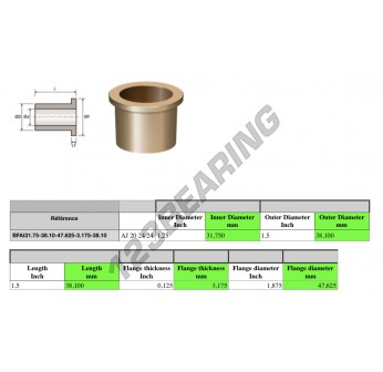 Os anéis flangeados de bronze BFAI31.75-38.10-47.625-3.175-38.10 têm um diâmetro interno de 31.75, um diâmetro externo de 38.1 e um comprimento de 38.1.