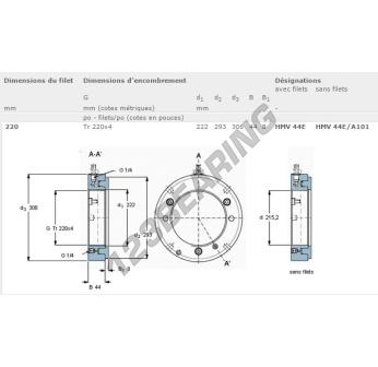 Esta porca tem um diâmetro interno de 222mm, um diâmetro externo de 306mm e uma espessura de 44mm.