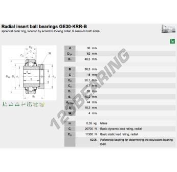 OAcessório De Mancal conhecido pela referência GE30-XL-KRR-B-INA, da marca INA tem um diâmetro interior de 30mm, um diâmetro exterior de 62mm e uma espessura de 48.5mm.