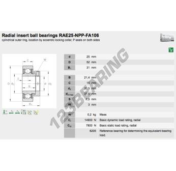 OAcessório De Mancal conhecido pela referência RAE25-XL-NPP-FA106-INA, da marca INA tem um diâmetro interior de 25mm, um diâmetro exterior de 52mm e uma espessura de 31mm.