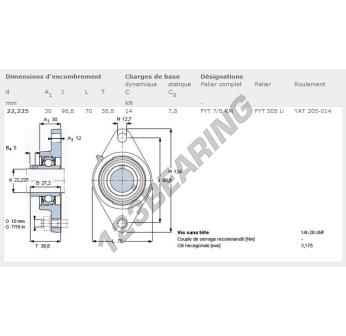 O Rolamento - 2 Fixadores conhecido pela referência FYT7-8-RM-SKF tem um diâmetro de furo de 22.23 e uma distância entre centros de fixação de 98.8. Esta referência é feita de ferro fundido e é apertada por parafuso de bloqueio.