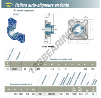 O rolamento de 4 parafusos EXF201-SNR tem um diâmetro de furo de 12 e uma distância entre centros de parafusos de 64. Esta referência é fabricada em ferro fundido fundido e é apertada por Anel de bloqueio excêntrico.