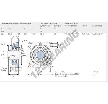 O rolamento de 4 parafusos FYJ70-TF-SKF tem um diâmetro de furo de 70 e uma distância entre centros de parafusos de 152. Esta referência é fabricada em ferro fundido fundido e é apertada por parafuso de bloqueio.