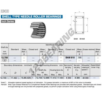 O Casquilho De Agulhas, conhecido pela referência BAM810-IKO, da marca IKO, tem um diâmetro interior de 12.7mm, um diâmetro exterior de 17.46mm e uma espessura de 15.88mm.