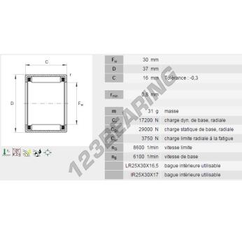 O Casquilho De Agulhas, conhecido pela referência HK3016-B-INA, da marca INA, tem um diâmetro interior de 30mm, um diâmetro exterior de 37mm e uma espessura de 16mm.