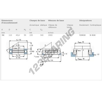 A Batente De Esferas, conhecido pela referência 53410-SKF, da marca SKF, tem um diâmetro interior de 50mm, um diâmetro exterior de 110mm e uma espessura de 45.6mm.