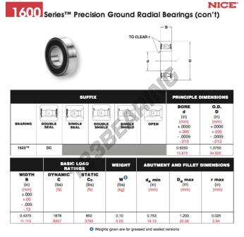 Concebido para durar, o Rolamento De Esferas conhecido pela referência : 1623-DC-NICE, da marca NICE tem um diâmetro interno de 15.875 mm, um diâmetro externo de 34.925 mm e uma espessura de 11.113 mm. Este produto é fiável e eficiente.