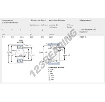 Concebido para durar, o Rolamento De Esferas conhecido pela referência : 3219-A-SKF, da marca SKF tem um diâmetro interno de 95 mm, um diâmetro externo de 170 mm e uma espessura de 55.6 mm. Este produto é fiável e eficiente.