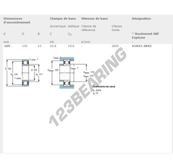 Concebido para durar, o Rolamento De Esferas conhecido pela referência : 61821-2RS-SKF, da marca SKF tem um diâmetro interno de 105 mm, um diâmetro externo de 130 mm e uma espessura de 13 mm. Este produto é fiável e eficiente.