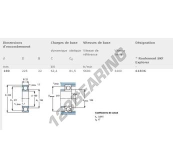 Concebido para durar, o Rolamento De Esferas conhecido pela referência : 61836-SKF, da marca SKF tem um diâmetro interno de 180 mm, um diâmetro externo de 225 mm e uma espessura de 22 mm. Este produto é fiável e eficiente.