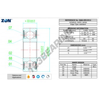 Concebido para durar, o Rolamento De Esferas conhecido pela referência : S686-2RS-W3.5-ZEN, da marca ZEN tem um diâmetro interno de 6 mm, um diâmetro externo de 13 mm e uma espessura de 3.5 mm. Este produto é fiável e eficiente.