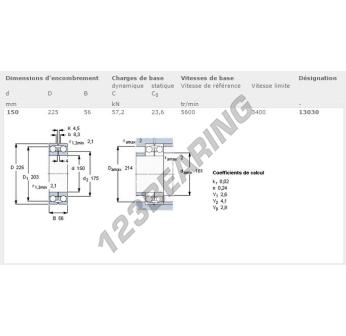 O Rolamento Com Rótula Sobre Esferas, conhecido pela referência 13030-SKF, da marca SKF, tem um diâmetro interior de 150mm, um diâmetro exterior de 225mm e uma espessura de 56mm.