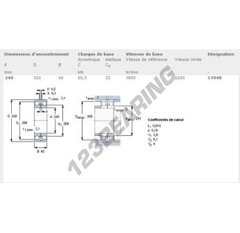 O Rolamento Com Rótula Sobre Esferas, conhecido pela referência 13948-SKF, da marca SKF, tem um diâmetro interior de 240mm, um diâmetro exterior de 320mm e uma espessura de 60mm.