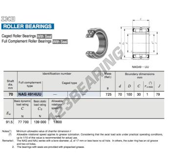 O outro rolamento, conhecido como NAU4914-UU-IKO, tem um diâmetro interno de 70 mm, um diâmetro externo de 100 mm e uma espessura de 30 mm.