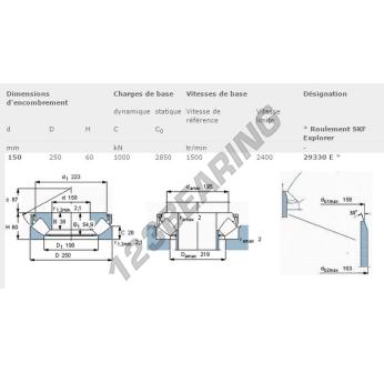 O Batente De Rolos, conhecido como 29330-E-SKF da marca SKF, tem um diâmetro interno de 150mm, um diâmetro externo de 250mm e uma espessura de 60mm.