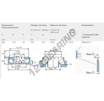O Batente De Rolos, conhecido como 29412-E-SKF da marca SKF, tem um diâmetro interno de 60mm, um diâmetro externo de 130mm e uma espessura de 42mm.