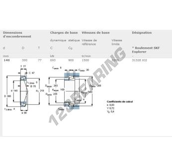 O Rolamento Cónico, conhecido pela referência 31328XJ2-SKF da marca SKF, tem um diâmetro interior de 140mm, um diâmetro exterior de 300mm e uma espessura de 77mm.