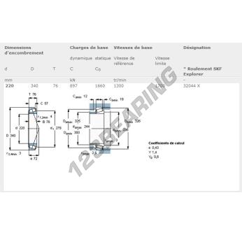 O Rolamento Cónico, conhecido pela referência 32044X-SKF da marca SKF, tem um diâmetro interior de 220mm, um diâmetro exterior de 340mm e uma espessura de 76mm.