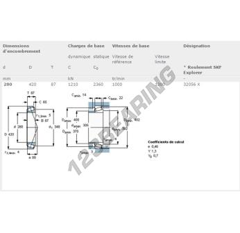 O Rolamento Cónico, conhecido pela referência 32056-X-SKF da marca SKF, tem um diâmetro interior de 280mm, um diâmetro exterior de 420mm e uma espessura de 87mm.