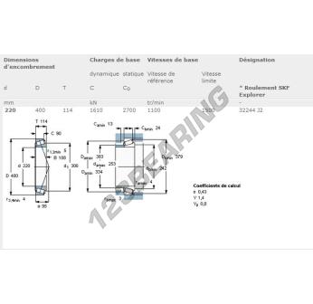 O Rolamento Cónico, conhecido pela referência 32244-J2-SKF da marca SKF, tem um diâmetro interior de 220mm, um diâmetro exterior de 400mm e uma espessura de 114mm.