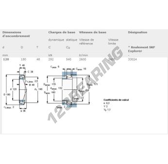 O Rolamento Cónico, conhecido pela referência 33024-SKF da marca SKF, tem um diâmetro interior de 120mm, um diâmetro exterior de 180mm e uma espessura de 48mm.