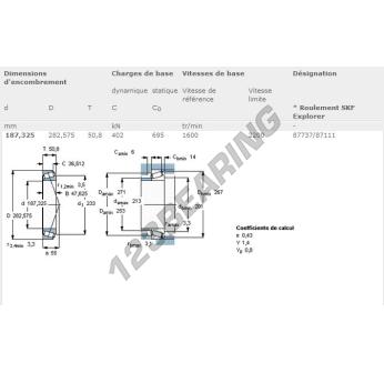 O Rolamento Cónico, conhecido pela referência 87737-87111-SKF da marca SKF, tem um diâmetro interior de 187.33mm, um diâmetro exterior de 282.58mm e uma espessura de 50.8mm.