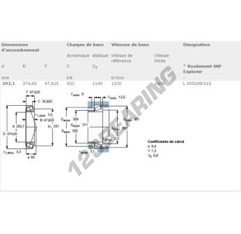 O Rolamento Cónico, conhecido pela referência L555249-L555210-SKF da marca SKF, tem um diâmetro interior de 292.1mm, um diâmetro exterior de 374.65mm e uma espessura de 47.63mm.