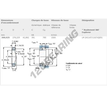 O Rolamento Cónico, conhecido pela referência LM241147-LM241110-VQ051-SKF da marca SKF, tem um diâmetro interior de 200.025mm, um diâmetro exterior de 276.225mm e uma espessura de 46.038mm.
