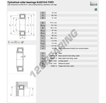 O rolamento de rolos, conhecido pela referência NJ2215-E-TVP2-FAG da marca FAG, tem um diâmetro interior de 75mm, um diâmetro exterior de 130mm e uma espessura de 31mm.