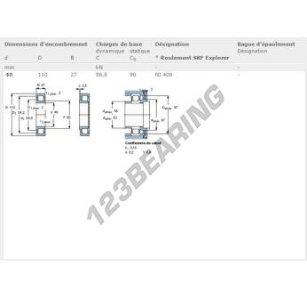 O rolamento de rolos, conhecido pela referência NJ408-SKF da marca SKF, tem um diâmetro interior de 40mm, um diâmetro exterior de 110mm e uma espessura de 27mm.