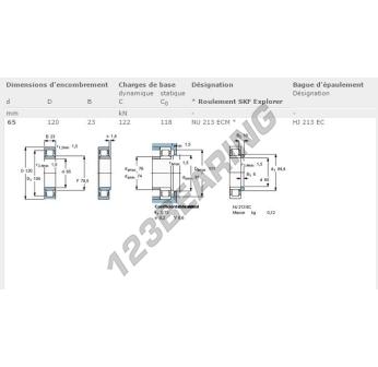 O rolamento de rolos, conhecido pela referência NU213-ECM-SKF da marca SKF, tem um diâmetro interior de 65mm, um diâmetro exterior de 120mm e uma espessura de 23mm.