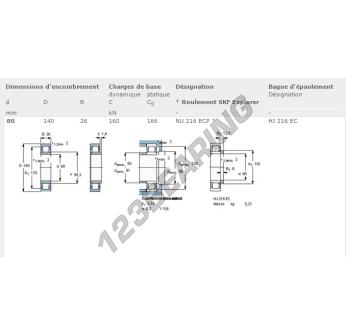 O rolamento de rolos, conhecido pela referência NU216-ECP-SKF da marca SKF, tem um diâmetro interior de 80mm, um diâmetro exterior de 140mm e uma espessura de 26mm.