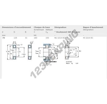 O rolamento de rolos, conhecido pela referência NU2214-ECP-SKF da marca SKF, tem um diâmetro interior de 70mm, um diâmetro exterior de 125mm e uma espessura de 31mm.