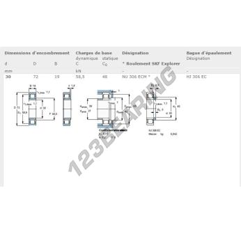 O rolamento de rolos, conhecido pela referência NU306-ECM-SKF da marca SKF, tem um diâmetro interior de 30mm, um diâmetro exterior de 72mm e uma espessura de 19mm.