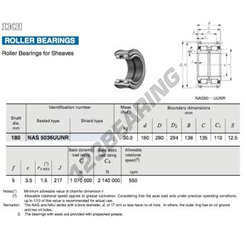 O rolamento de rolos, conhecido pela referência SL045036-PPX-IKO da marca IKO, tem um diâmetro interior de 180mm, um diâmetro exterior de 280mm e uma espessura de 136mm.