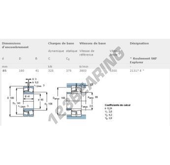 O Rolamento Com Rótula Sobre Rolos, conhecido pela referência 21317-E-SKF da marca SKF, tem um diâmetro interior de 85mm, um diâmetro exterior de 180mm e uma espessura de 41mm.