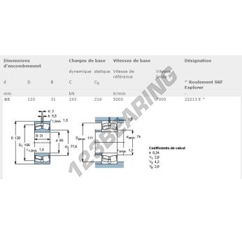 O Rolamento Com Rótula Sobre Rolos, conhecido pela referência 22213-E-SKF da marca SKF, tem um diâmetro interior de 65mm, um diâmetro exterior de 120mm e uma espessura de 31mm.
