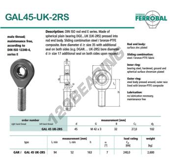 A Rótula Ge conhecida como GAL45-UK-2RS-DURBAL tem um diâmetro interno de 45mm, um diâmetro externo de 102mm e uma espessura de 32mm.