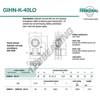 A Rótula Ge conhecida como GIHN-K-40LO-DURBAL tem um diâmetro interno de 40mm, um diâmetro externo de 90mm e uma espessura de 33mm.