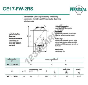 A Rotula Geew, conhecida pela referência GE17-FW-2RS-DURBAL, da marca DURBAL tem um diâmetro interno de 17mm, um diâmetro externo de 35mm e uma espessura de 12mm.