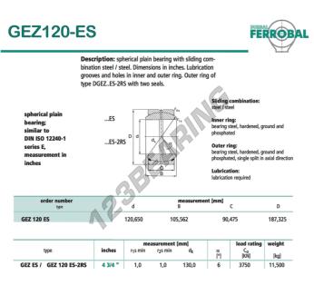 A Rotula Geew, conhecida pela referência GEZ120-ES-DURBAL, da marca DURBAL tem um diâmetro interno de 120.65mm, um diâmetro externo de 187.325mm e uma espessura de 90.475mm.