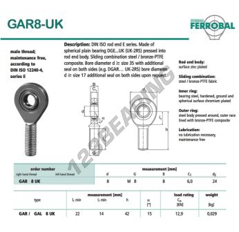 A Rotula Sa conhecida pela referência GAR8-UK-DURBAL, da marca DURBAL tem uma rosca direita, um diâmetro interno de 8mm, um diâmetro externo de 24mm e uma espessura de 8mm.