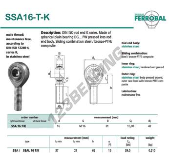 A Rotula Sa conhecida pela referência SSA16-T-K-DURBAL, da marca DURBAL tem uma rosca direita, um diâmetro interno de 16mm, um diâmetro externo de 42mm e uma espessura de 21mm.