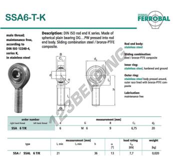 A Rotula Sa conhecida pela referência SSA6-T-K-DURBAL, da marca DURBAL tem uma rosca direita, um diâmetro interno de 6mm, um diâmetro externo de 20mm e uma espessura de 9mm.